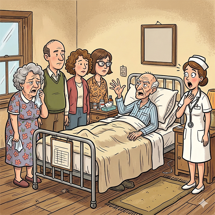 An elderly man lay on his d3athbed, surrounded by his wife, three kids, and a nurse.