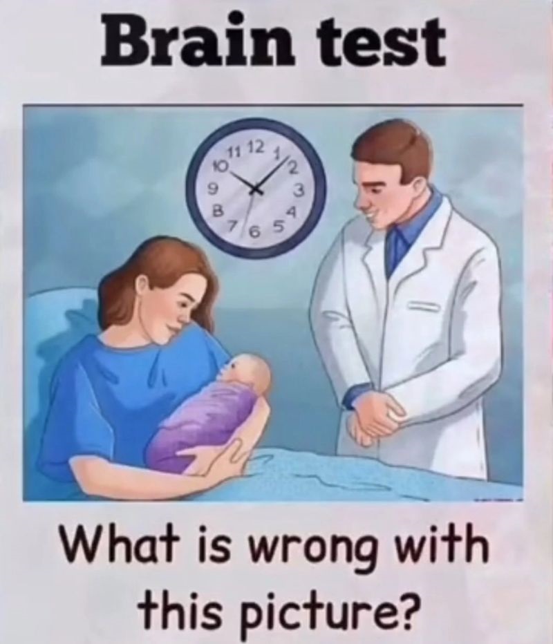 In the above image, you have to spot the mistake hidden inside the picture where a mother is holding her newborn baby in the presence of a doctor inside a hospital room. In the image, you can see a maternity ward of a hospital, and there is a clock inside the room.