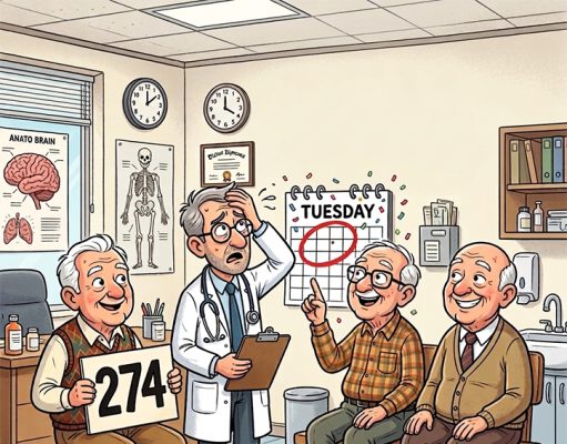 Three elderly men visit the doctor’s office for a memory test.
