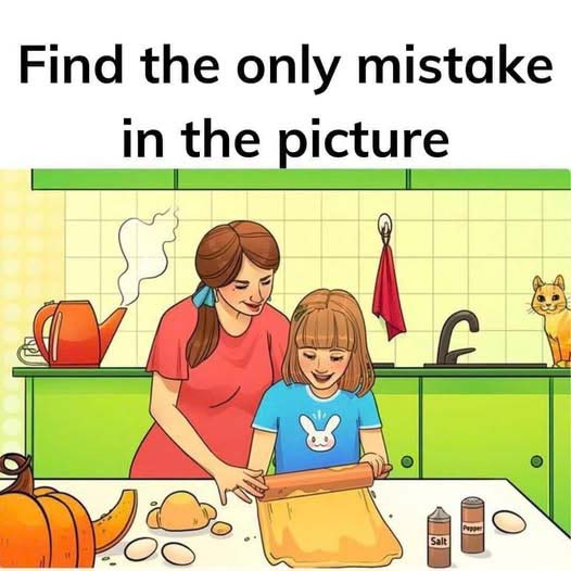 The image shows a heartwarming scene of a mother and daughter working together to roll out dough in the kitchen. It looks cheerful and familiar, but a couple of subtle errors are hidden within this everyday setting. Can you find them?