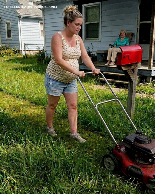 The old push mower rattled violently as she tried to force it through grass that had grown far too tall. It nearly reached her calves, uneven and stubborn. She leaned into the handle with both hands, her small frame trembling with the effort.