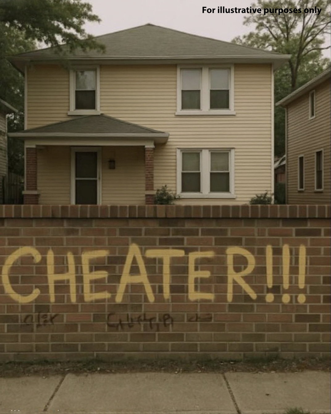 I followed him to the front window, still wiping sleep from my eyes. Across the street, the fence of my old house was covered in spray paint. Bright yellow letters spelled out ugly words I won’t repeat, but they were about me, Pete, and the nasty things Don thought of us.