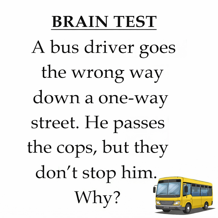 Here is the mystery: A bus driver goes the wrong way down a one-way street. He passes the cops, but they don’t stop him. Why?