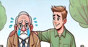 A 90-year-old man is sitting on a park bench, sobbing
