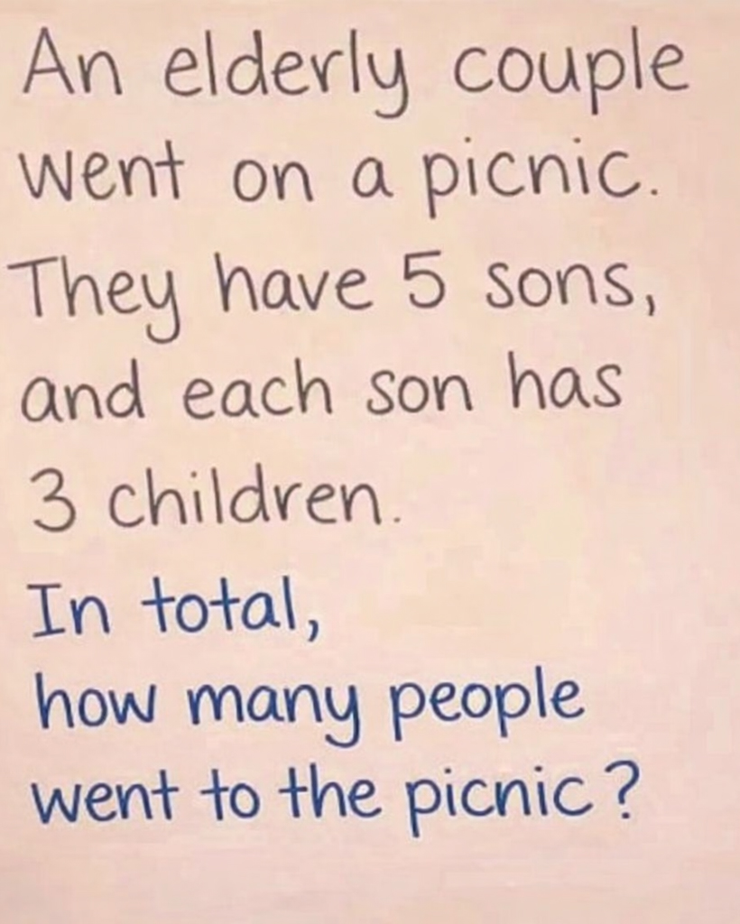 Why? We said, at the beginning of the riddle, that the elderly couple went on a picnic. However, we never said that the sons and their children also went. That information is there to throw you off. Most of you probably sat down and counted – without need.